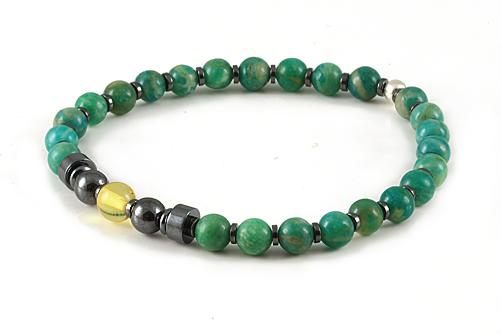 6mm amazonite beads, hematite beads and amber bead. The beads are strung together with an elastic tie and this size fits most wrists. All our products are supplied in a Stylish Jewelry Gift Box.