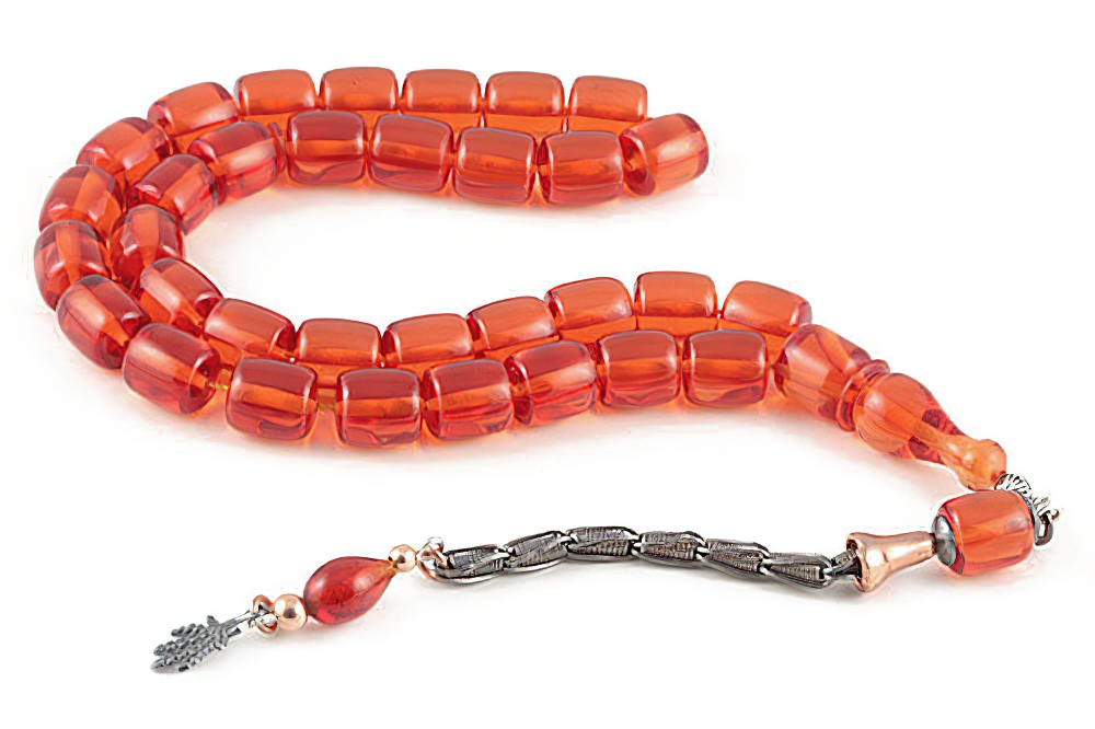 Handcrafted of 33 red amber bakelite beads, handle and Sterling silver tassel. The spacing between the beads is around 2-3 beads wide. All our products are supplied in a Stylish Jewelry Gift Box.