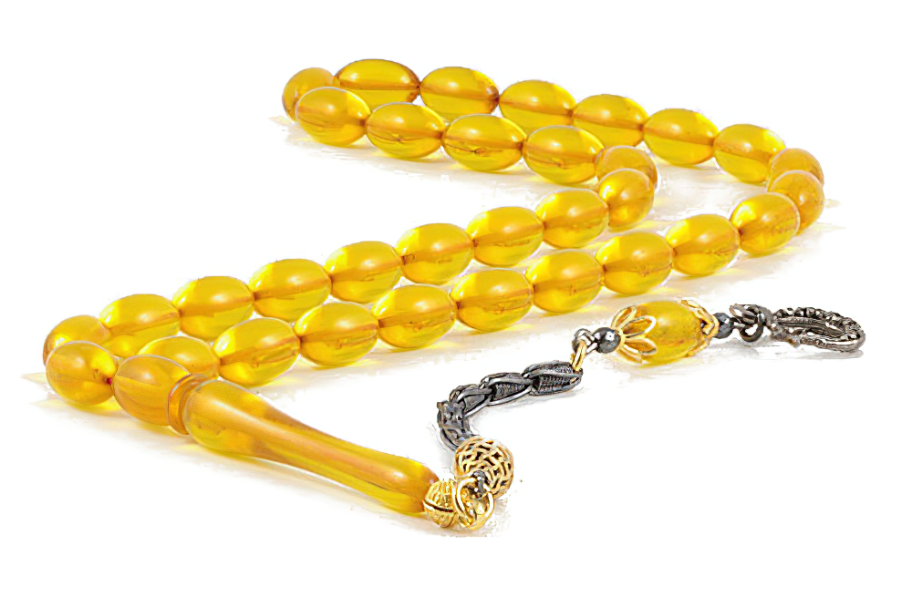 Handcrafted of 33 amber bakelite beads, handle and Sterling silver tassel. The spacing between the beads is around 2-3 beads wide. All our products are supplied in a Stylish Jewelry Gift Box.