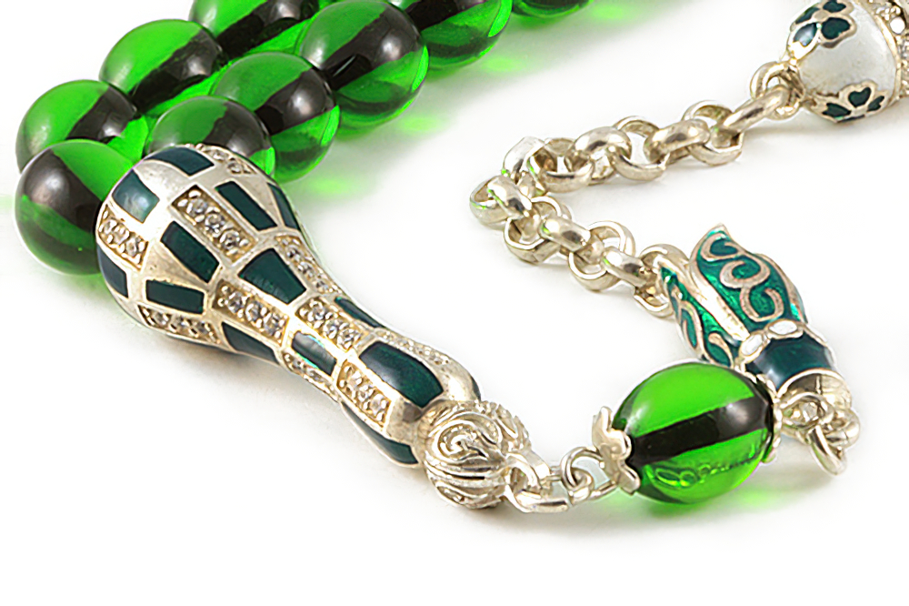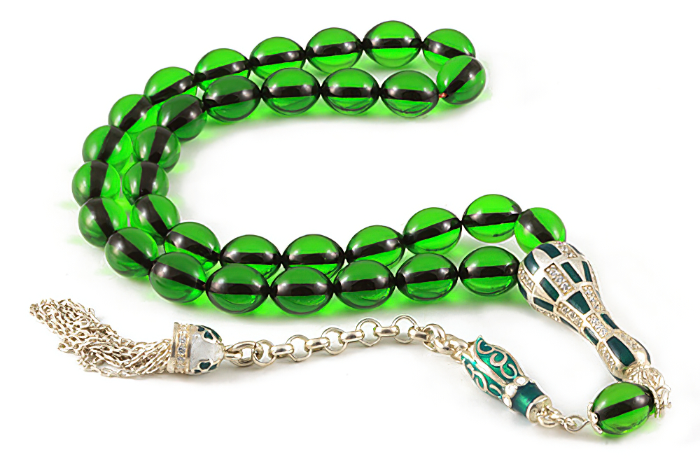 Handcrafted of 33 green amber bakelite beads, zirconia beaded, enamel silver handle and tassel. The spacing between the beads is around 2-3 beads wide. Free express shipping handmade luxury gift box.