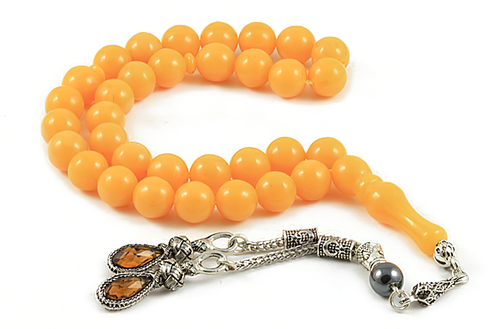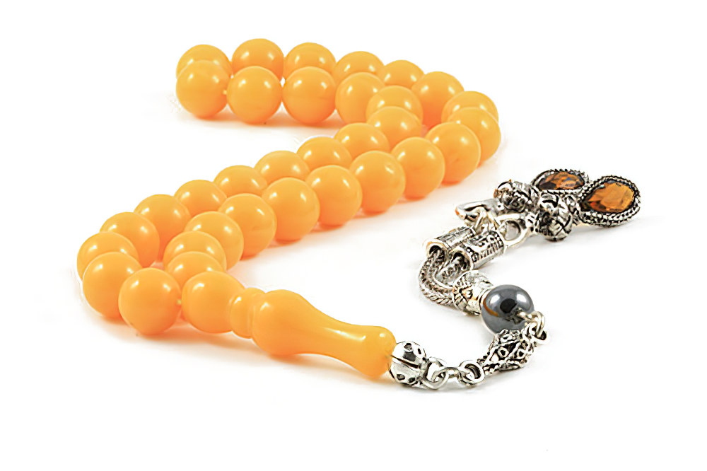 Handcrafted of 33 Lebanese amber bakelite beads, handle and zirconia beaded tassel. All prayer beads are supplied in a Stylish Jewelry Gift Box.
