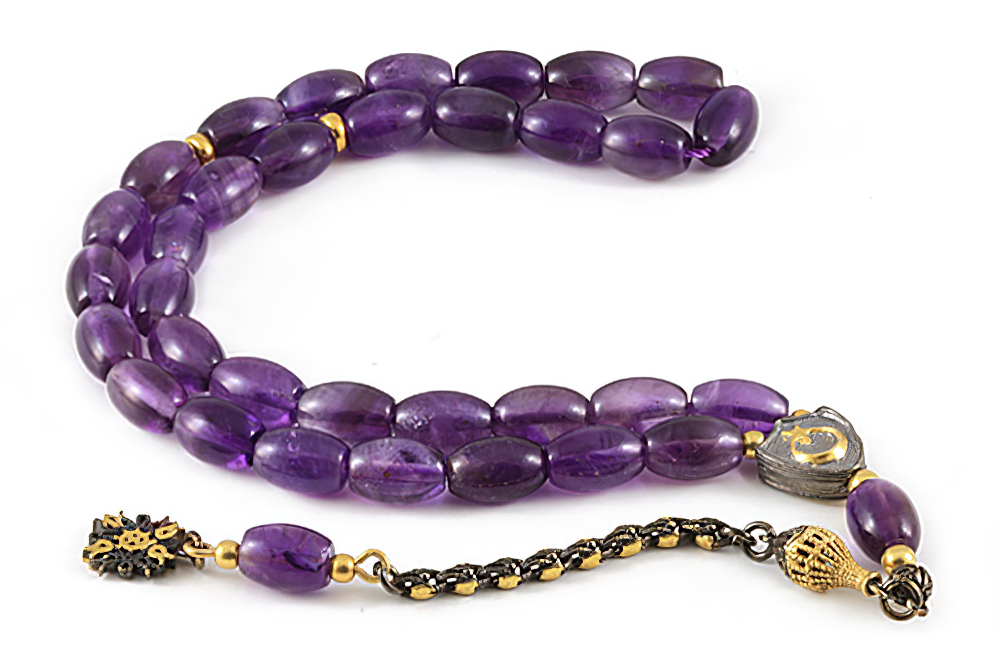 Handcrafted of 33 high grade genuine amethyst beads, coloured Sterling silver spacers, handle & tassel. The spacing between the beads is around 2-3 beads wide. All our products are supplied in a Stylish Jewelry Gift Box.