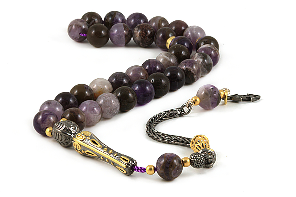 Handcrafted of 33 count high grade genuine amethyst beads, 925 silver (Sterling) spacers, handle and tassel. The spacing between the beads is around 2-3 beads wide. All our products are supplied in a Stylish Jewelry Gift Box.