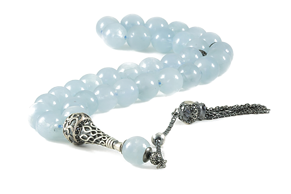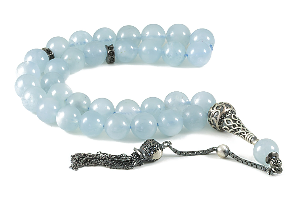 10mm genuine aquamarine beads, zirconia beaded 925 silver (Sterling) spacers, 925 silver (Sterling) handle and tassel. The spacing between the beads is around 2-3 beads wide. All our products are supplied in a Stylish Jewelry Gift Box.