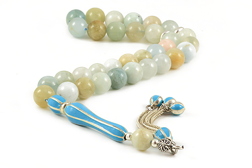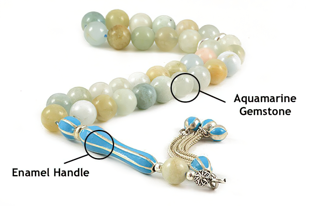 8mm 33 count genuine aquamarine beads, finished with enamel handle and tassel. The spacing between the beads is around 2-3 beads wide. All our products are supplied in a Stylish Jewelry Gift Box.