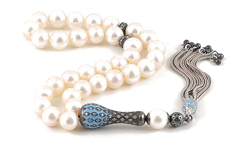 Handcrafted of 33 cultured freshwater pearl beads, zirconia beaded – enamel silver handle & tassel. The spacing between the beads is around 2-3 beads wide. Free of Charge Worldwide Delivery. All our products are supplied in a Stylish Jewelry Gift Box.
