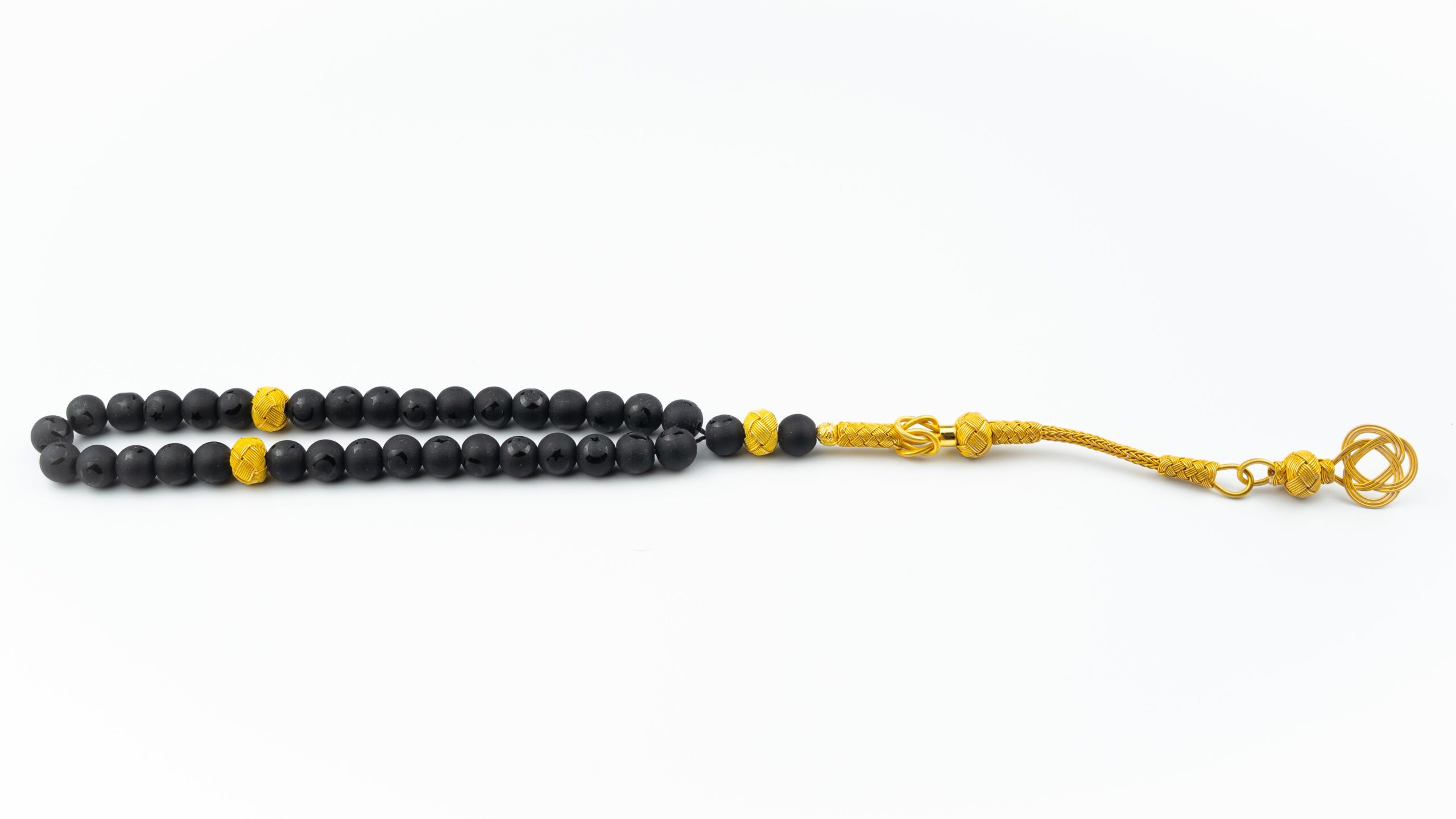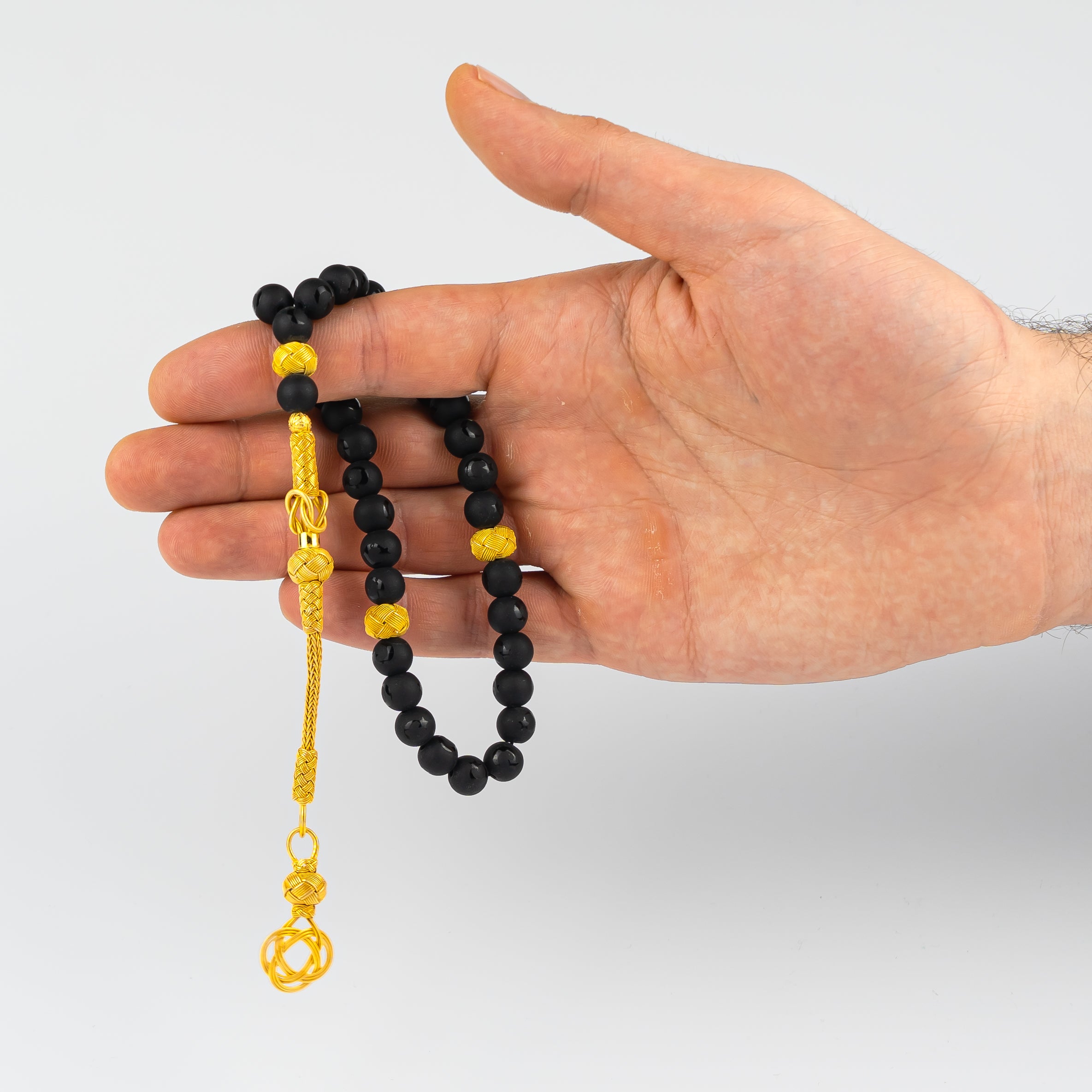 Crafted with 33 beads, each measuring 8 mm, this tasbih features the depth and elegance of Onyx, a stone long associated with inner strength and clarity. Its intense black finish is elevated with intricately woven gold-plated silver spacers and a matching gold-plated tassel, echoing the timeless grandeur of Islamic artistry.