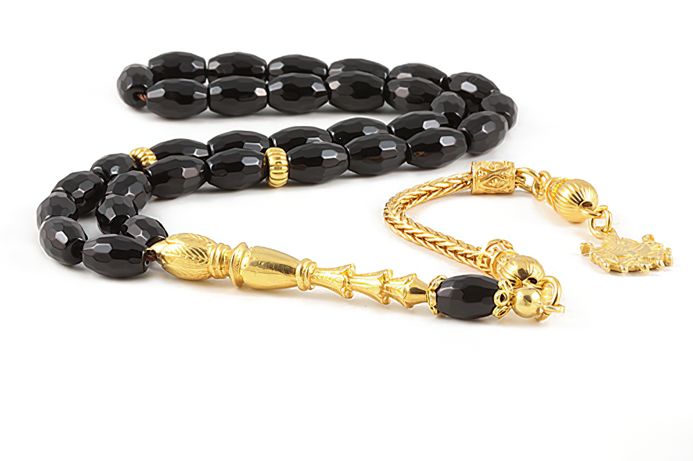 The black onyx subha showcases richly polished beads paired with an ornate gold Ottoman-style chain tassel. The luxurious gold detailing contrasts beautifully with the deep black stones, creating a regal presence. Smooth and well-weighted beads offer a comfortable and grounding prayer experience. Designed for both spiritual use and visual impact, this misbaha stands out with classic elegance. A distinguished piece inspired by heritage craftsmanship.