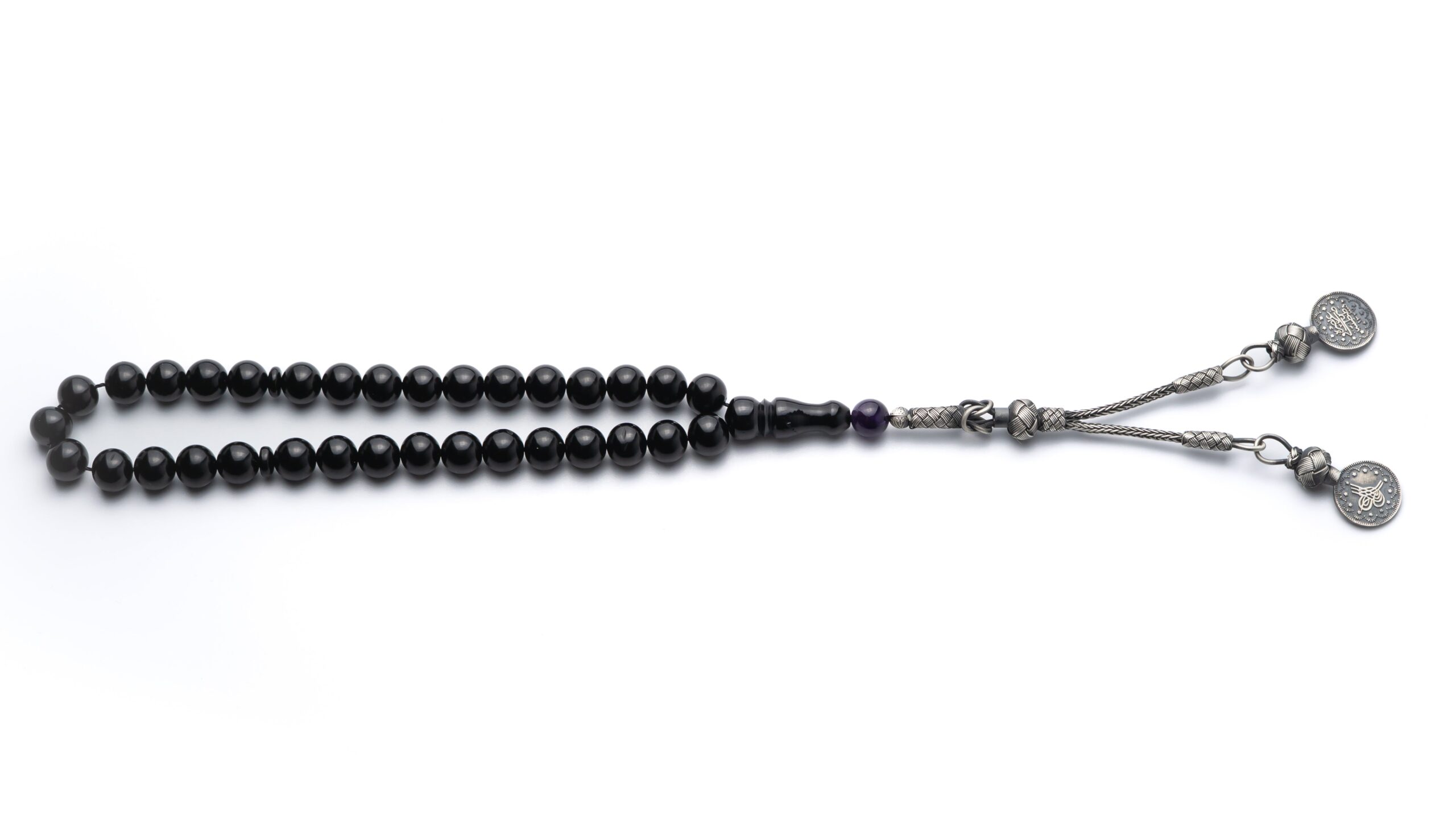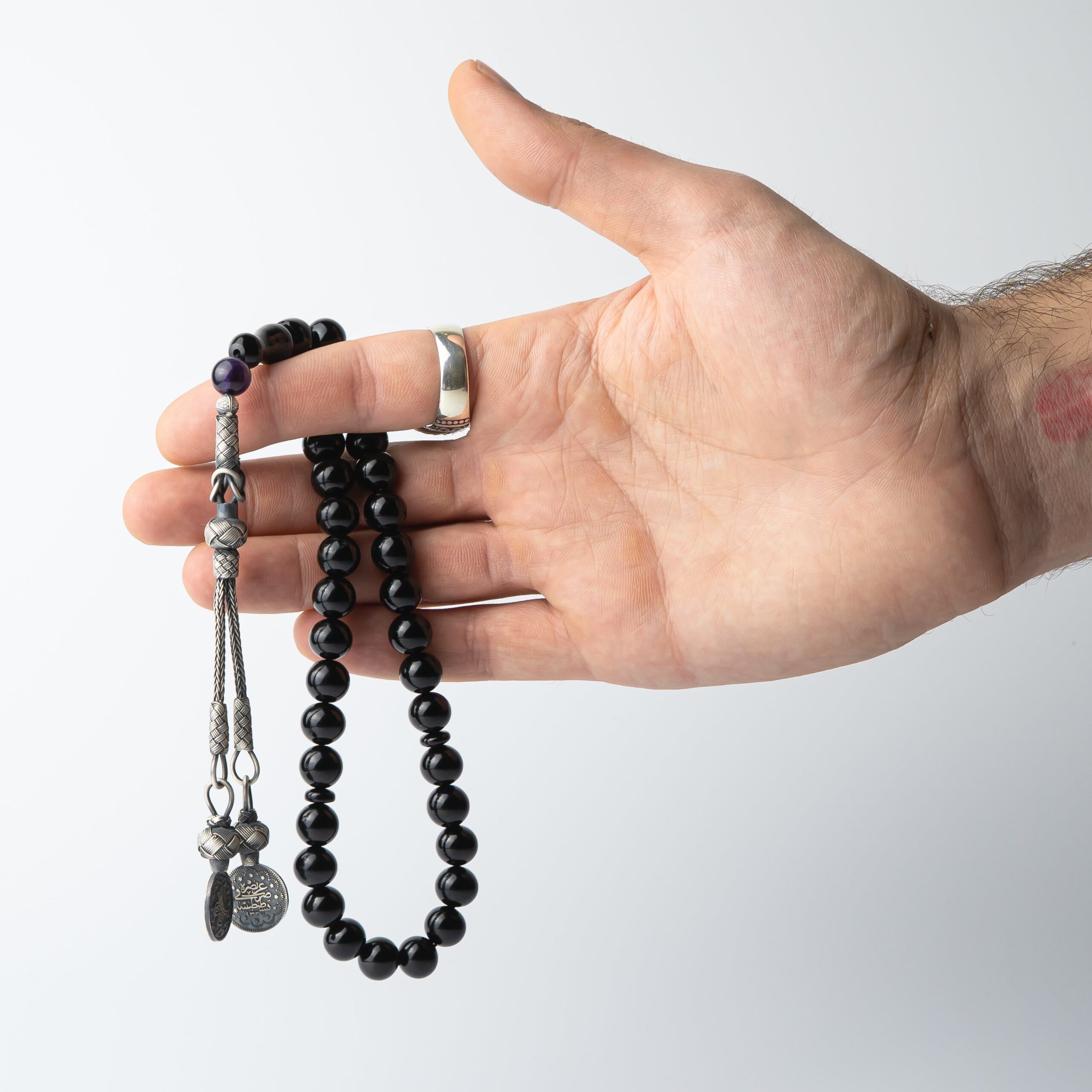 Crafted in Istanbul by master artisans, this elegant Black Sultan tasbih features deep black amber beads and a meticulously designed 925 sterling silver tassel adorned with authentic Ottoman-style coins.