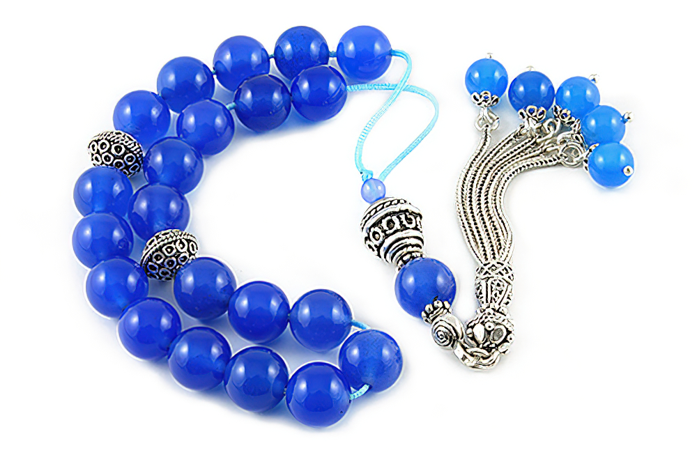 Handcrafted of 21 high grade genuine blue agate beads, two silver seperator beads, handle and tassel. Free of Charge Worldwide Delivery. All our products are supplied in a Stylish Jewelry Gift Box.