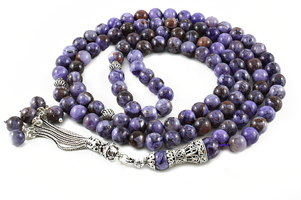 Handcrafted of 108 high grade genuine charoite beads, Sterling silver seperators, handle and tassel. Free of Charge Worldwide Delivery. All our products are supplied in a Stylish Jewelry Gift Box.