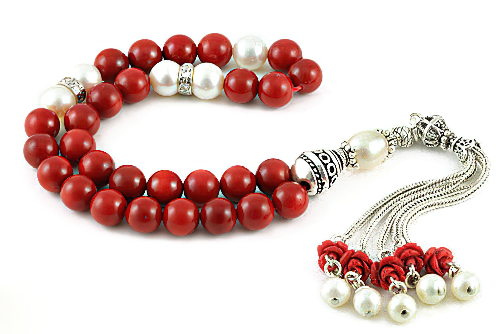 Handcrafted of 33 genuine coral & cultured freshwater pearl beads, zirconia spacers, pearl handle and Sterling silver tassel. The spacing between the beads is around 2-3 beads wide. Free of Charge Worldwide Delivery. All our products are supplied in a Stylish Jewelry Gift Box.