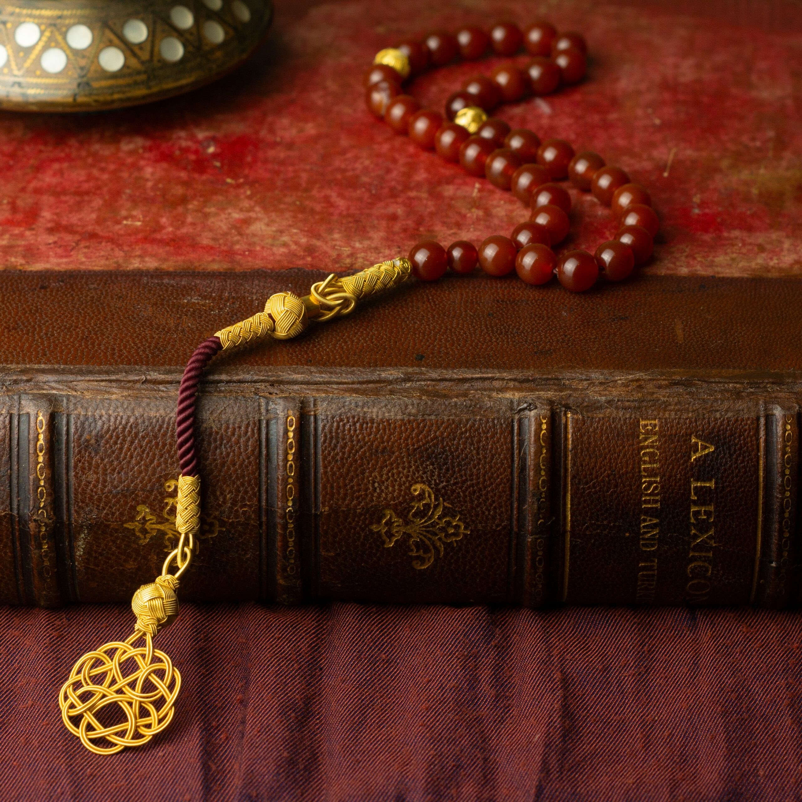 Crimson Legacy is a handcrafted prayer bead set made in Istanbul, featuring 8mm polished red agate stones — cherished for their grounding energy and vibrant color. Each bead is hand-strung with care and precision, embodying centuries of tradition. The 1000-karat sterling silver tassel is crafted in the authentic Trabzon kazaz style and richly plated in gold, enhancing its elegance and spiritual presence. A timeless piece that combines Turkish craftsmanship with natural strength and beauty, perfect for both daily reflection and meaningful gifting.