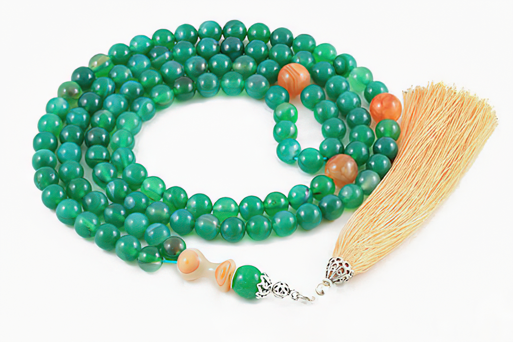Handcrafted of 108 genuine green agate beads, Yemen agate seperators, handle and silk tassel. Free HandHandcrafted Luxury Gift Box.