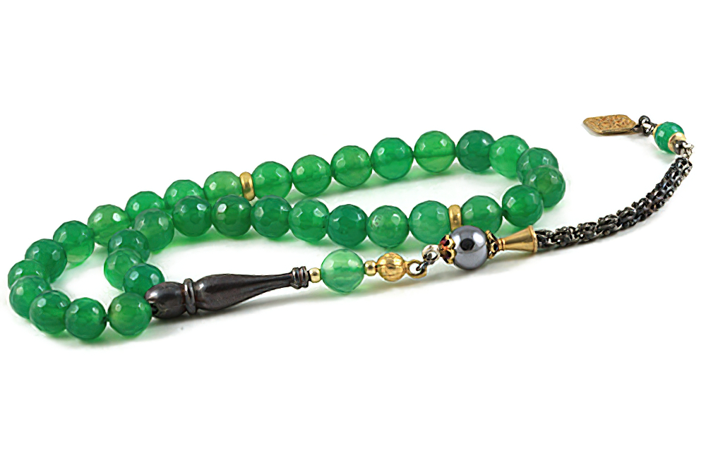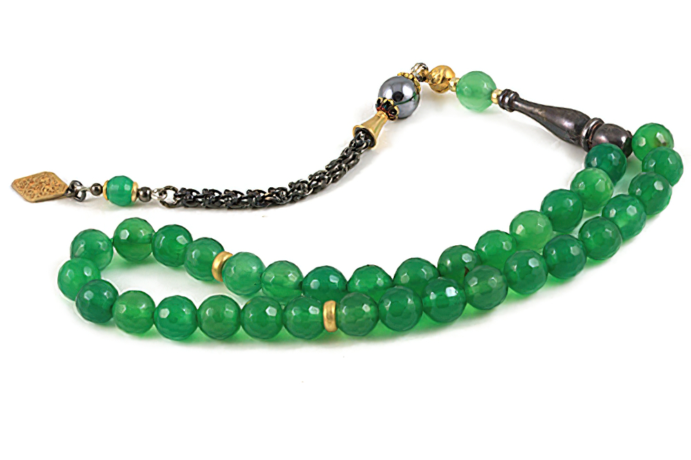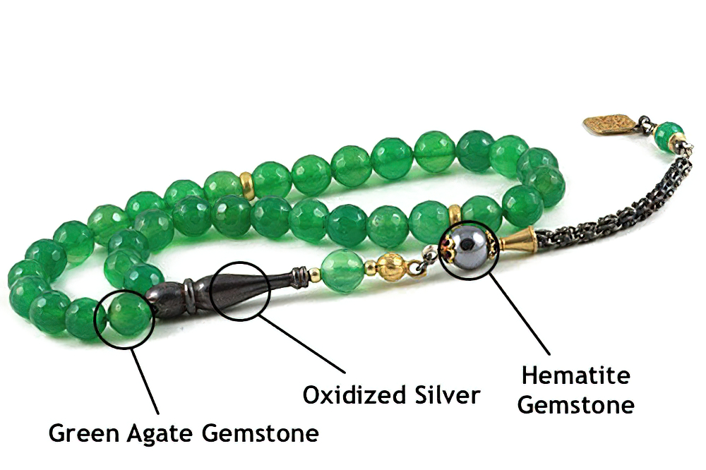 Handcrafted of 33 genuine, faceted green agate beads, 925 silver (Sterling) beads, handle and tassel. The spacing between the beads is around 2-3 beads wide. All our products are supplied in a Stylish Jewelry Gift Box.