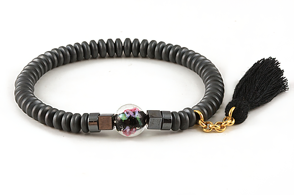 Handcrafted of high grade hematite gemstone beads and 10mm Murano glass. The beads are strung together with an elastic tie and this size fits most wrists. All our products are supplied in a Stylish Jewelry Gift Box.