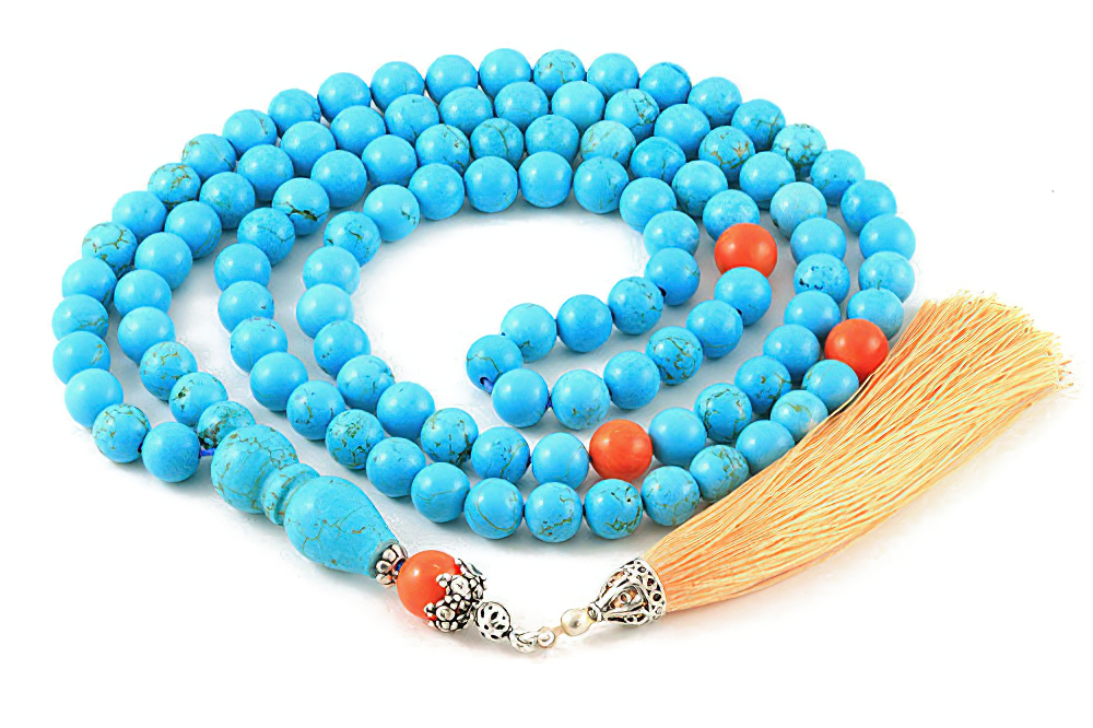 Handcrafted of 108 genuine howlite turquoise beads, coral seperators, howlite turquoise handle, silver and silk tassel. Free HandHandcrafted Luxury Gift Box.