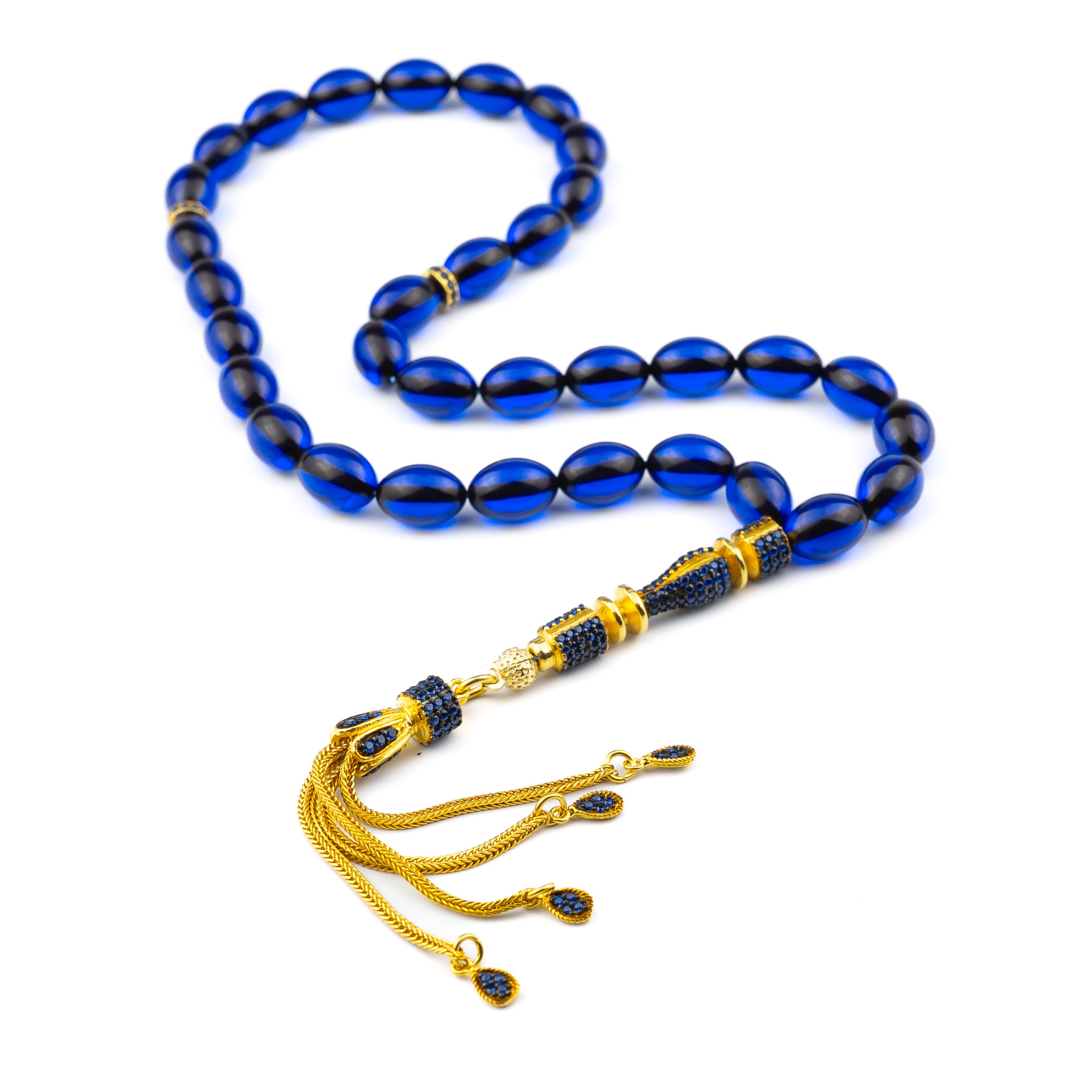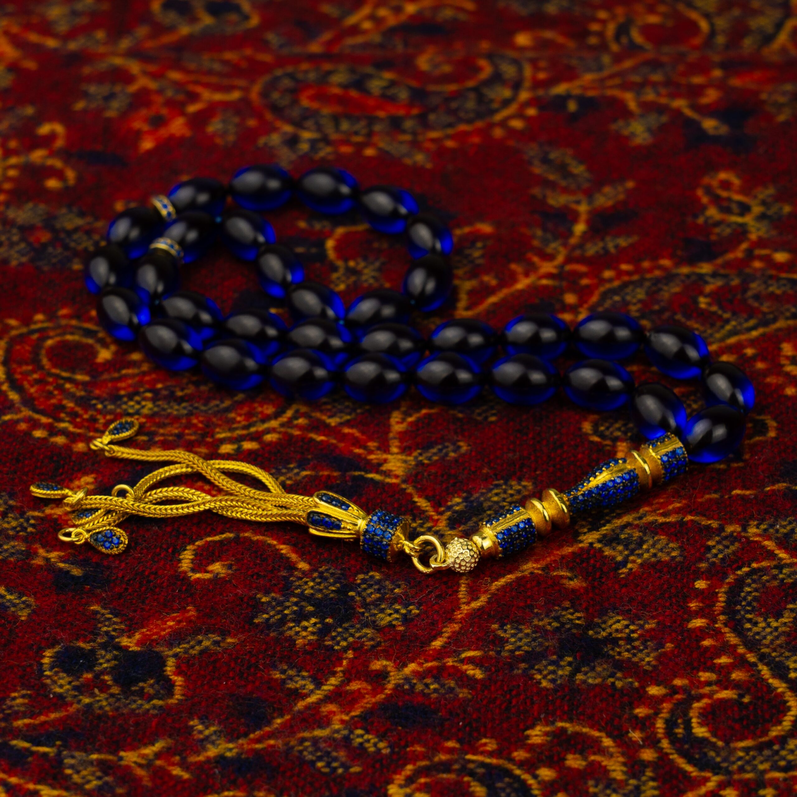 The Imperial Gleam tasbih radiates presence and precision. Composed of 33 deep blue prest-amber beads in a unique oval cut, this piece offers both tactile fluidity and visual impact. The slight transparency of each bead reveals the silk-thread core running through — a subtle yet deliberate design choice that amplifies the sense of depth and elegance.