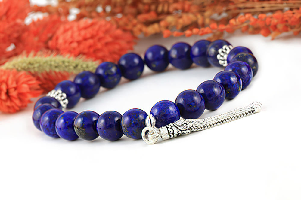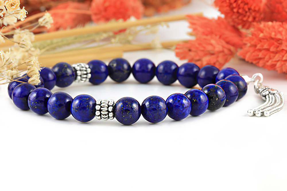 Handcrafted of high grade genuine lapis lazuli beads, 925 silver (Sterling) beads and tassel. You can customise this product with any name on silver beads. The beads are strung together with an elastic tie and this size fits most wrists. All our products are supplied in a Stylish Jewelry Gift Box.
