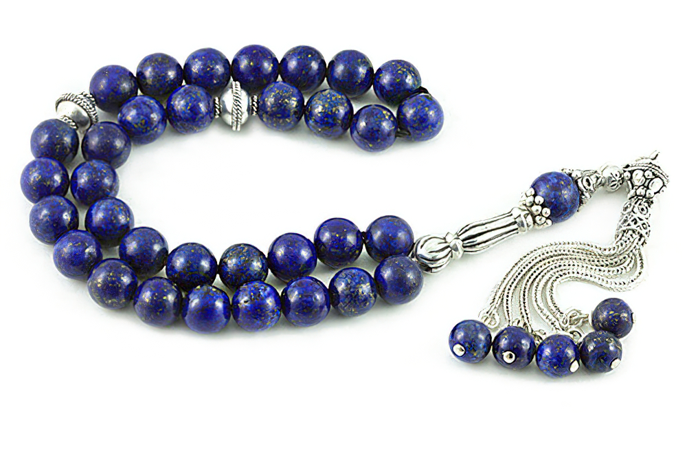 8mm 33 count high grade genuine lapis lazuli beads, Sterling silver spacers, handle and tassel. You can customise this product with any name on silver beads. The spacing between the beads is around 2-3 beads wide. Free of Charge Worldwide Delivery. All our products are supplied in a Stylish Jewelry Gift Box.
