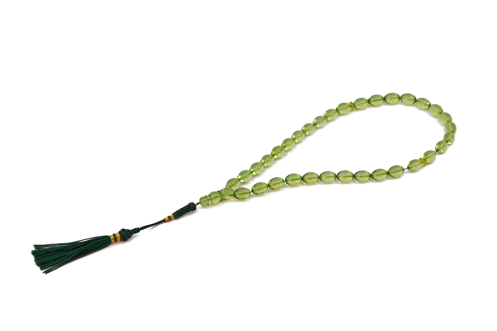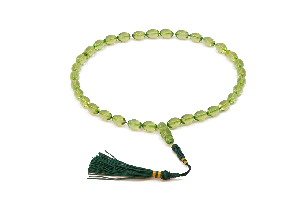 Handcrafted of 33 NATURAL green Amber beads, Amber Imam and cotton tassel. The spacing between the beads is around 2-3 beads wide. Free World Wide Delivery and Handmade Luxury Gift box.