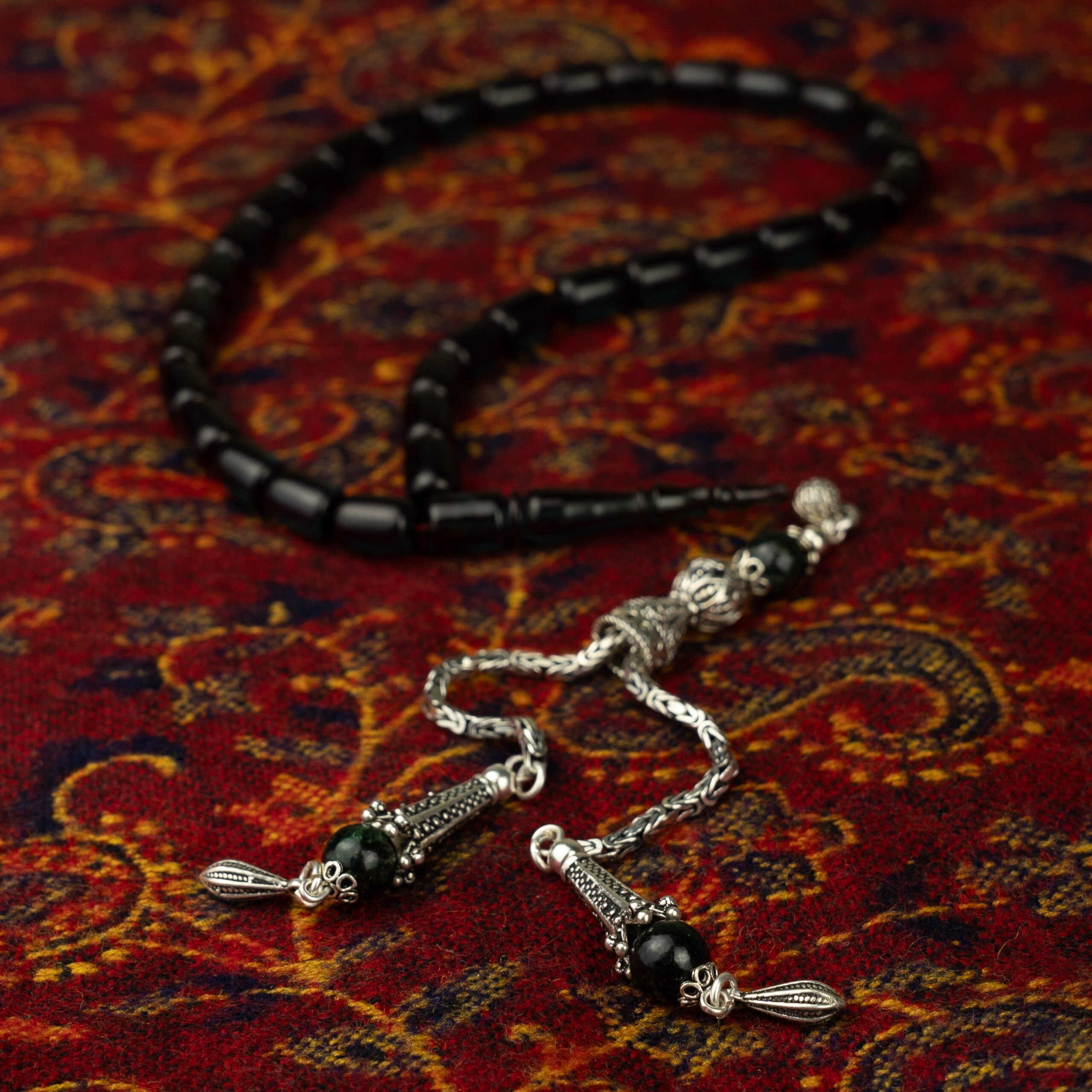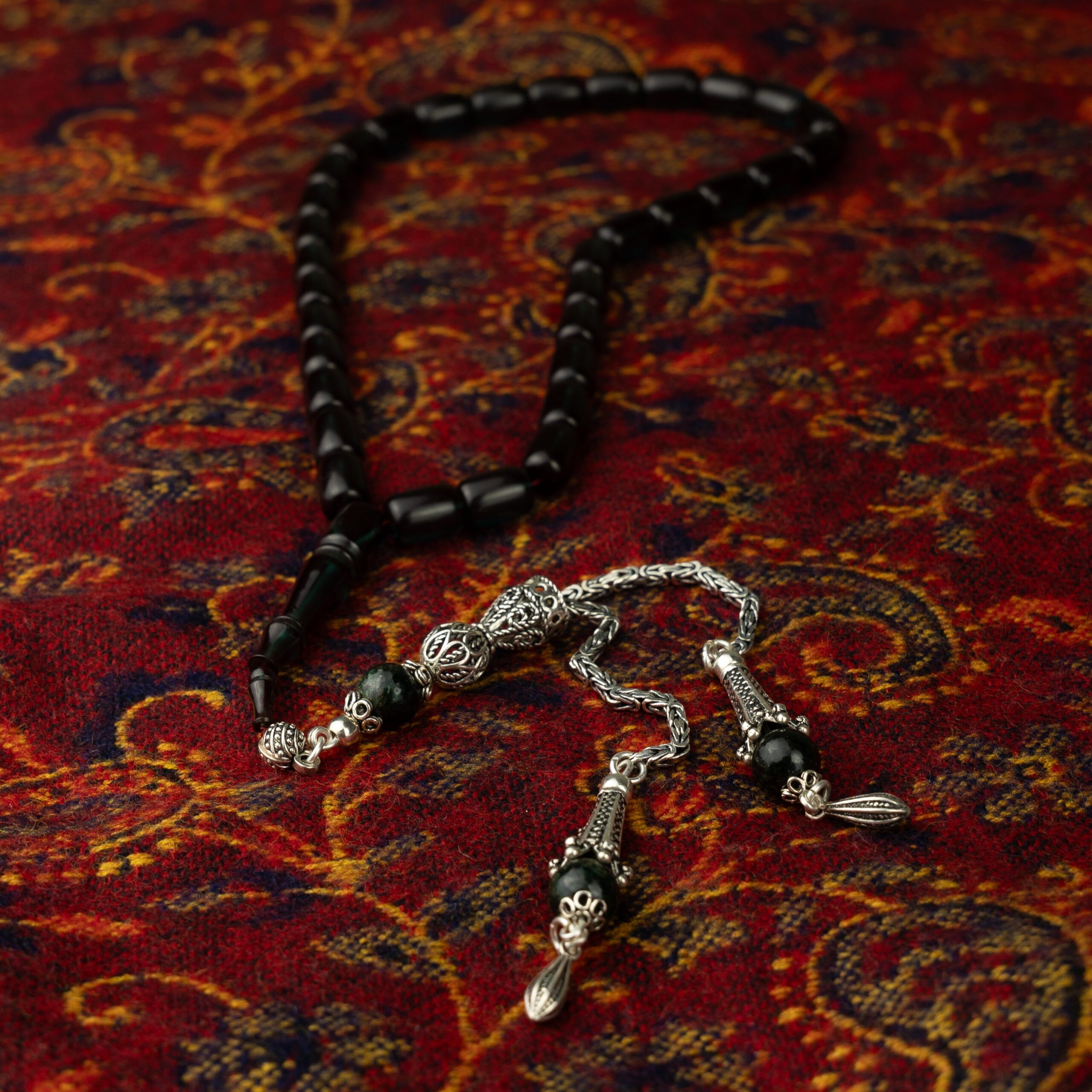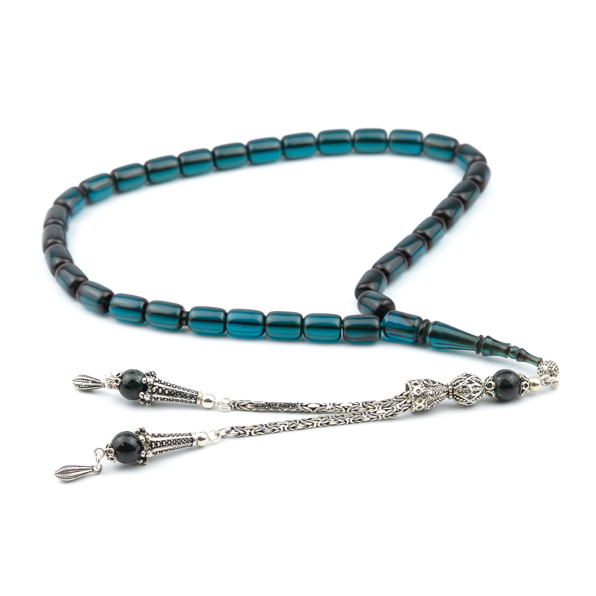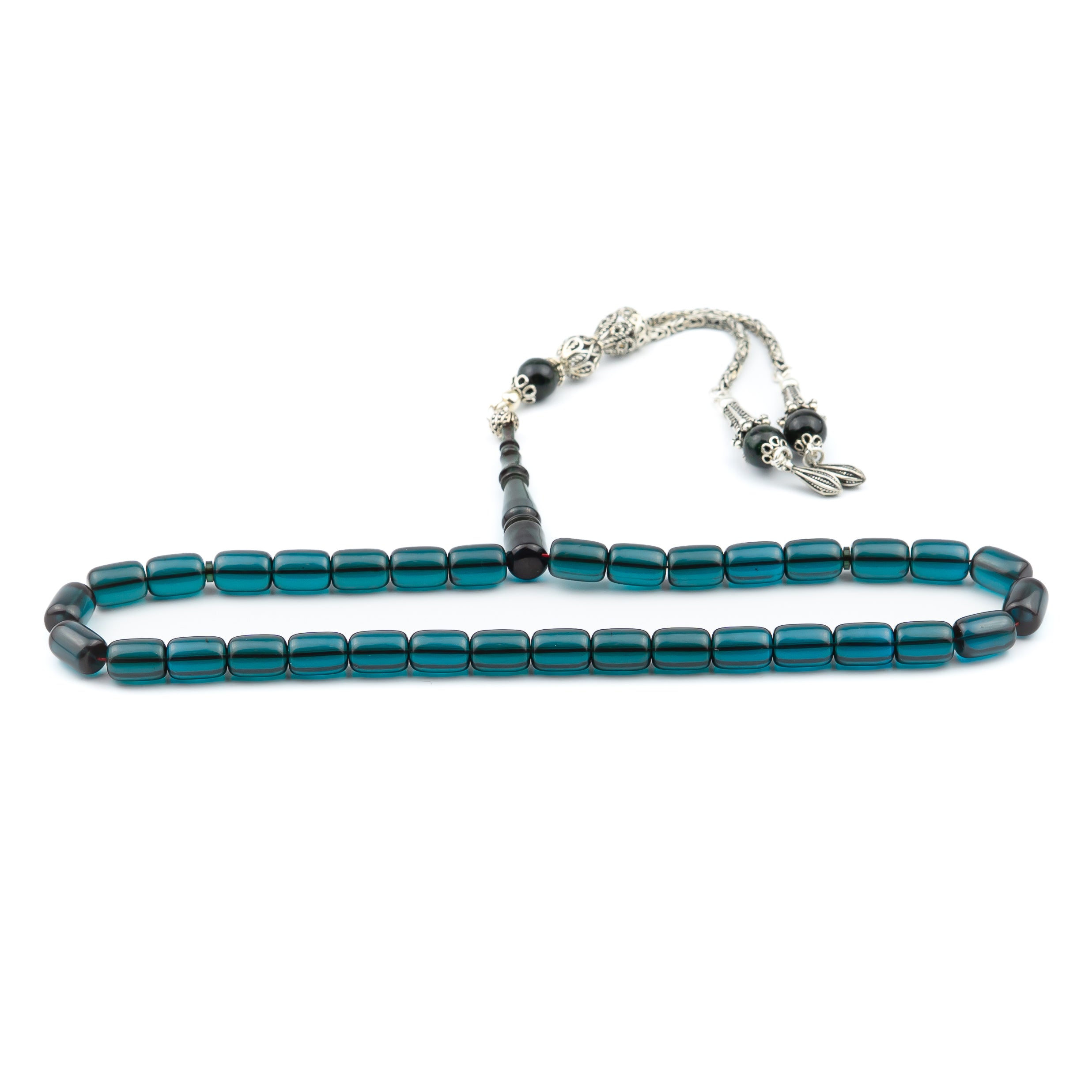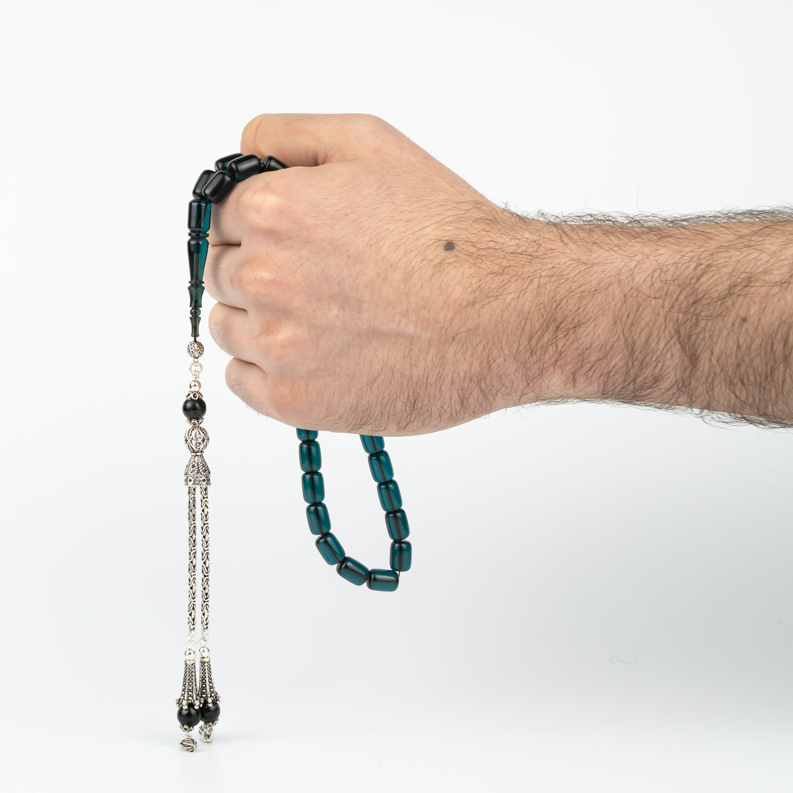Midnight Elegance is a celebration of symmetry and style. Crafted from deep-toned pressed amber, this tasbih exudes quiet confidence. Each bead is perfectly shaped to invite touch and contemplation, while the fusion silver tassels—meticulously handcrafted—add a heritage-rich detail. Enhancing its visual harmony, natural stones in tones echoing the tasbih’s midnight blue are placed at the head of each tassel, creating a refined and intentional balance. This piece is not only for reflection, but for those who carry taste as part of their identity.