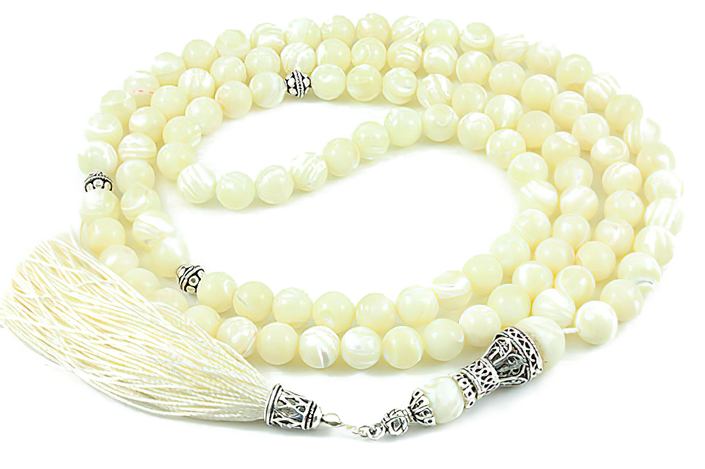 Handcrafted of 108 genuine mother of pearl beads, Sterling silver seperators, silver handle, natural cotton tassel. Free of Charge Worldwide Delivery. All our products are supplied in a Stylish Jewelry Gift Box.