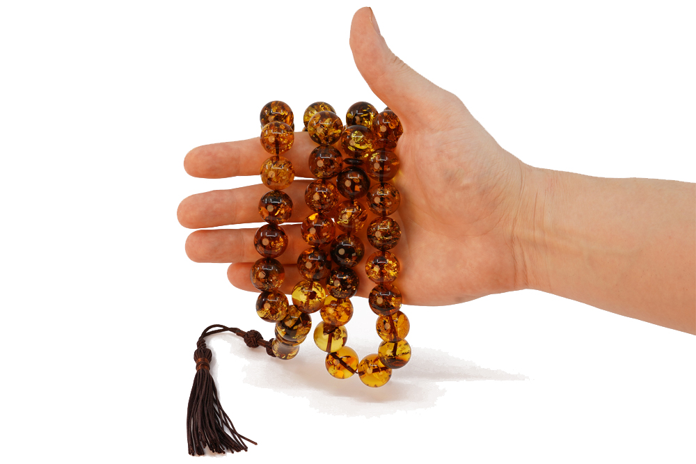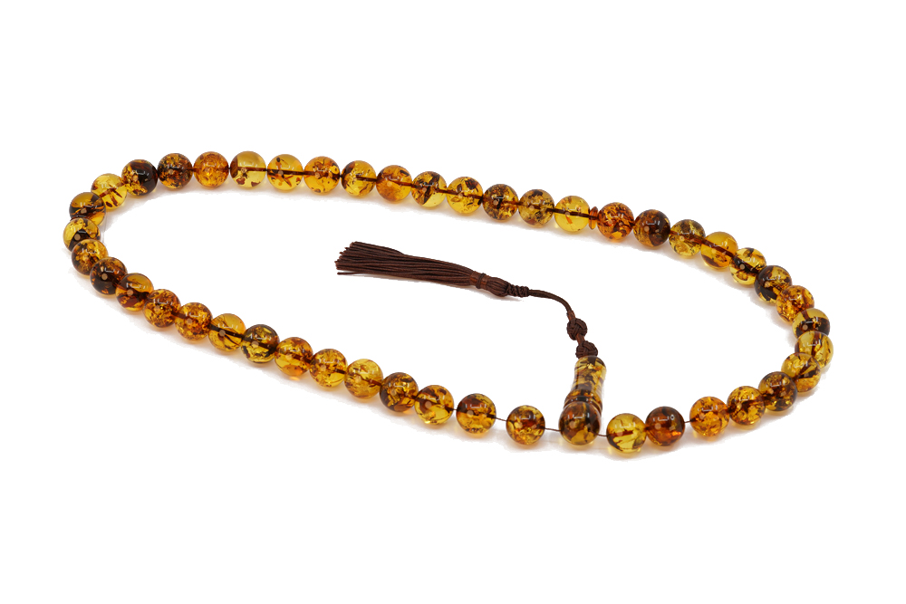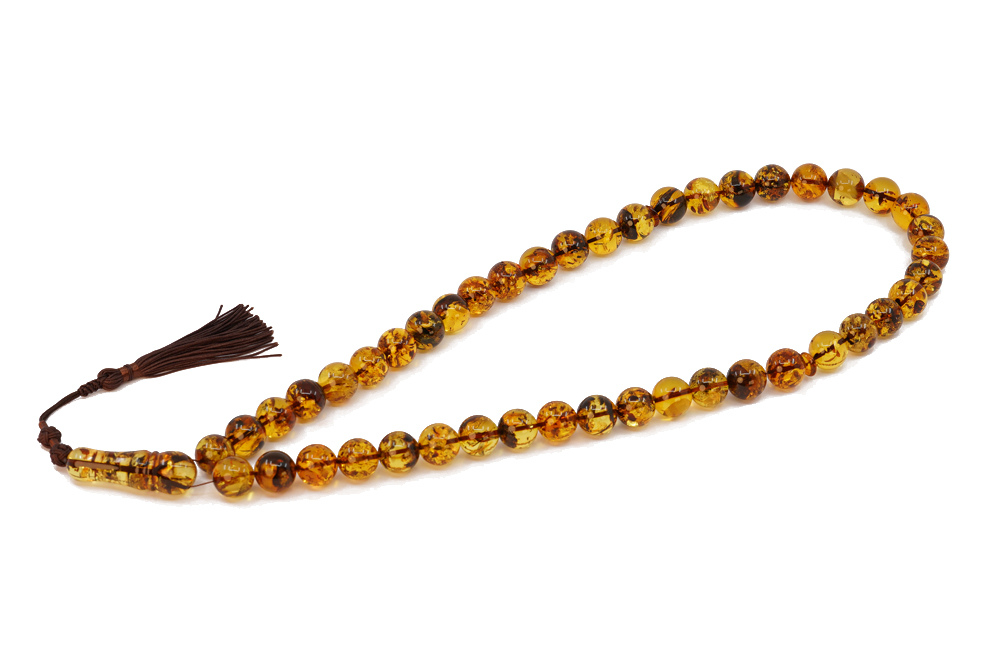 Handcrafted of 45 NATURAL brown Amber beads with Inclusions, Amber Imam and cotton tassel. The spacing between the beads is around 2-3 beads wide. Free handmade luxury gift box.