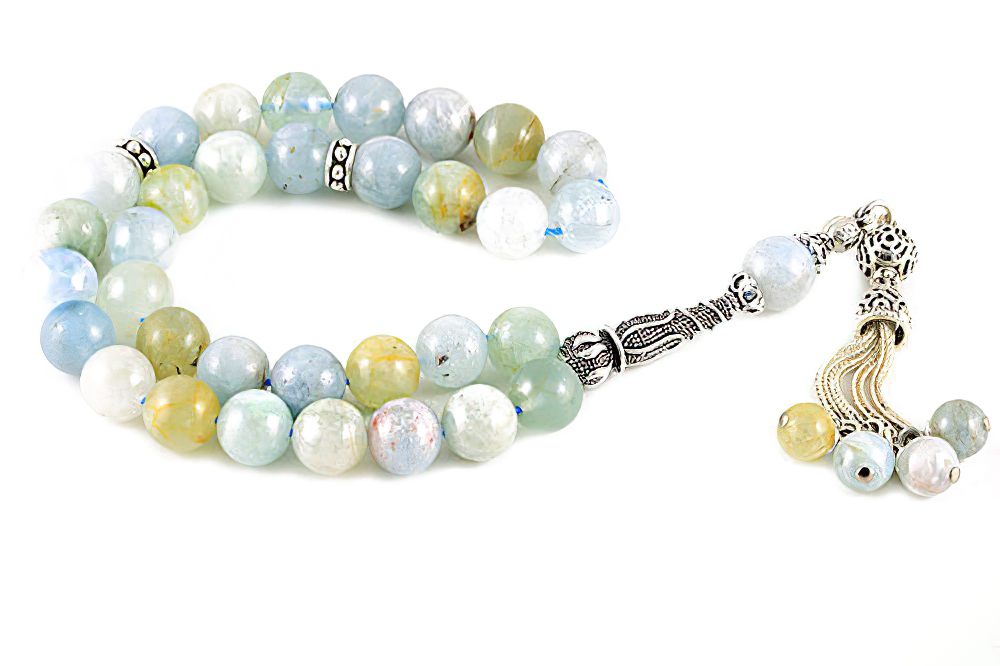 Handcrafted of 33 high grade genuine aquamarine beads, 925 silver (Sterling) beads, handle and tassel. The spacing between the beads is around 2-3 beads wide. Free of Charge Worldwide Delivery. All our products are supplied in a Stylish Jewelry Gift Box.