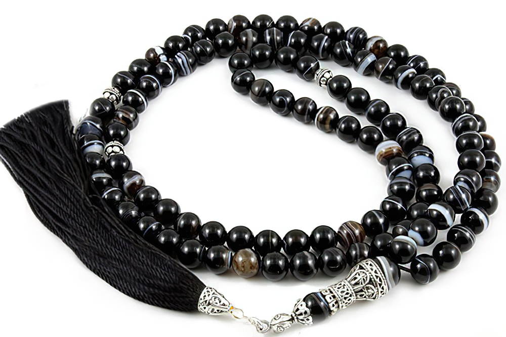 Handcrafted of 108 high grade genuine onyx beads, Sterling silver seperators, handle and natural cotton tassel. Free of Charge Worldwide Delivery. All our products are supplied in a Stylish Jewelry Gift Box.