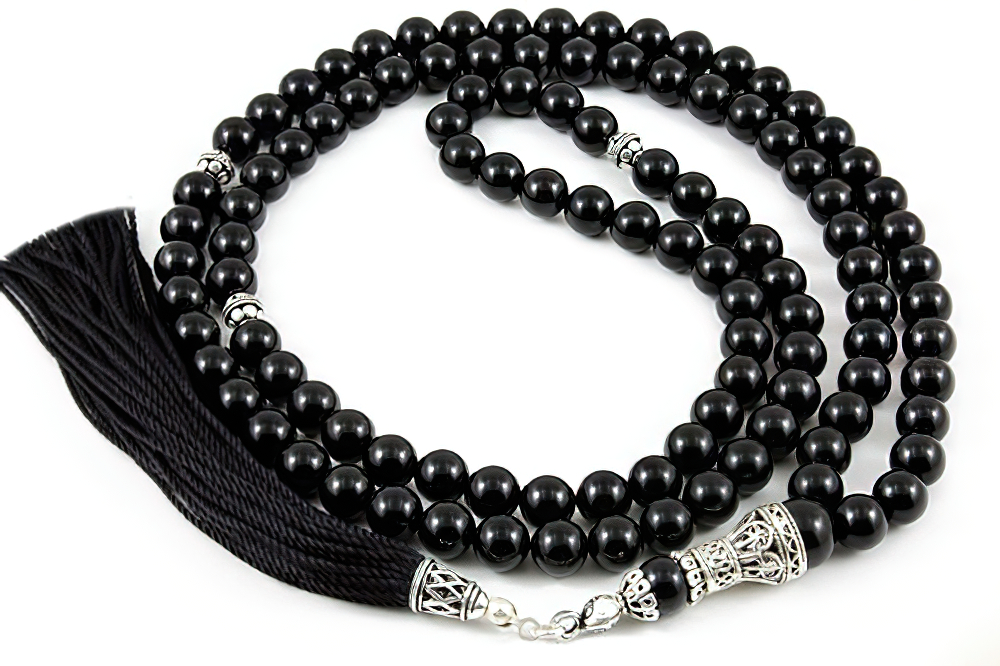 Handcrafted of 108 high grade genuine black onyx beads, Sterling silver seperators, handle and natural cotton tassel. Free of Charge Worldwide Delivery. All our products are supplied in a Stylish Jewelry Gift Box.
