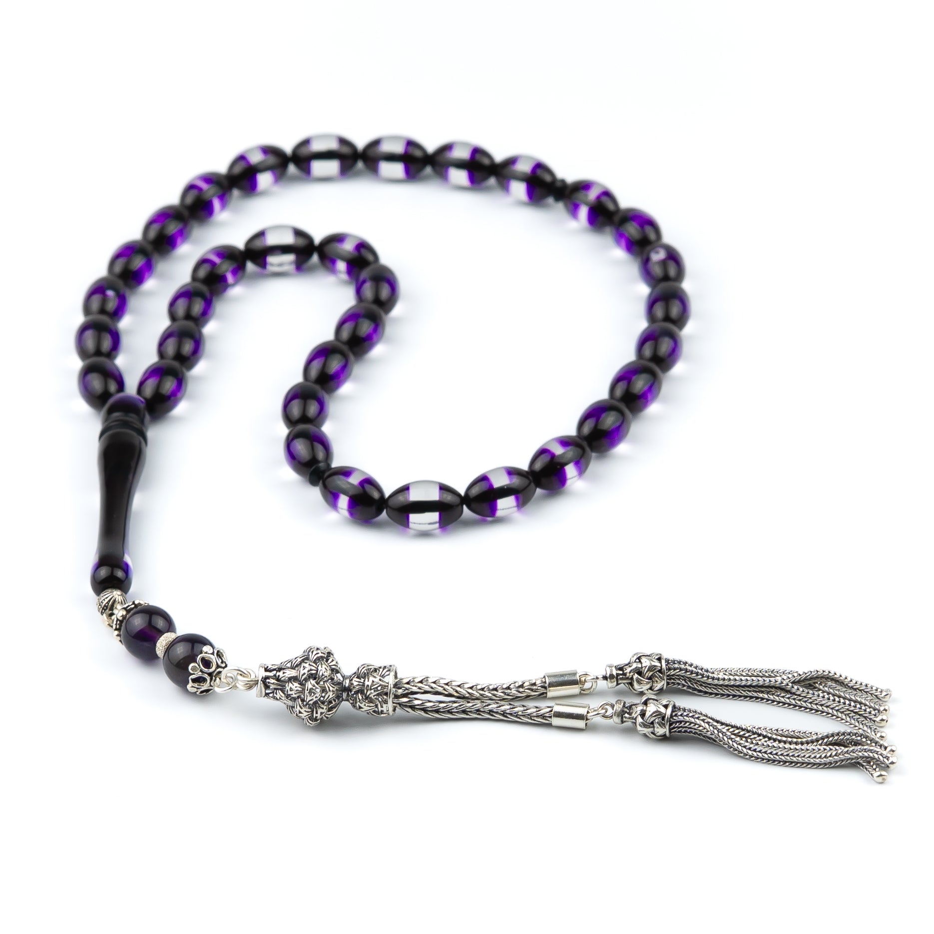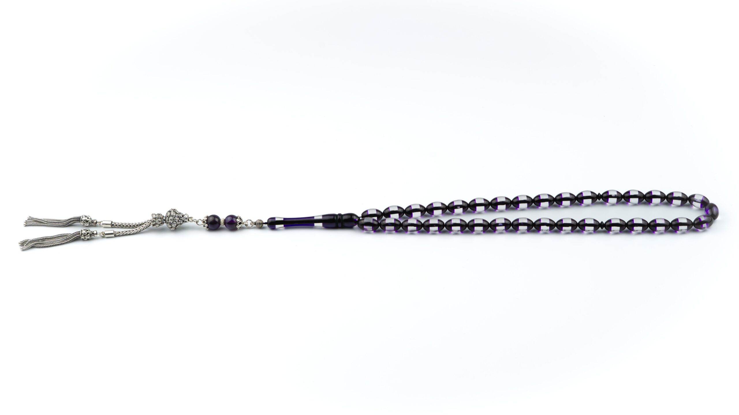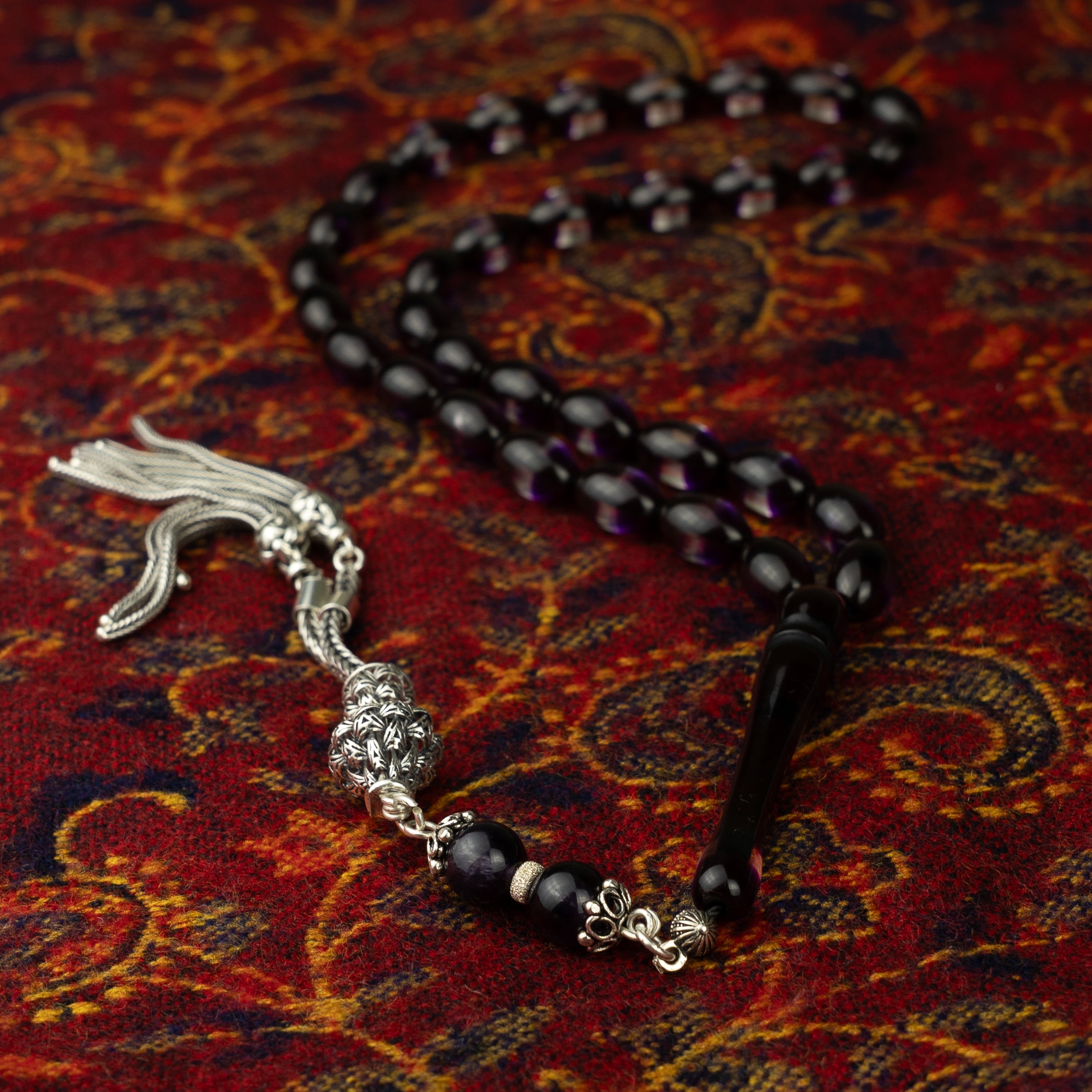 Violet Eclipse captures the mystique of twilight in a handcrafted form. Each bead, shaped from radiant fire amber, reveals a translucent purple core that shifts subtly with the light—inviting quiet contemplation and aesthetic pleasure. The imame flows gracefully into a fusion silver tassel, meticulously detailed with Ottoman-style motifs. This tasbih is a celebration of shadow and shimmer, designed for those who value distinction in the palm of their hand.