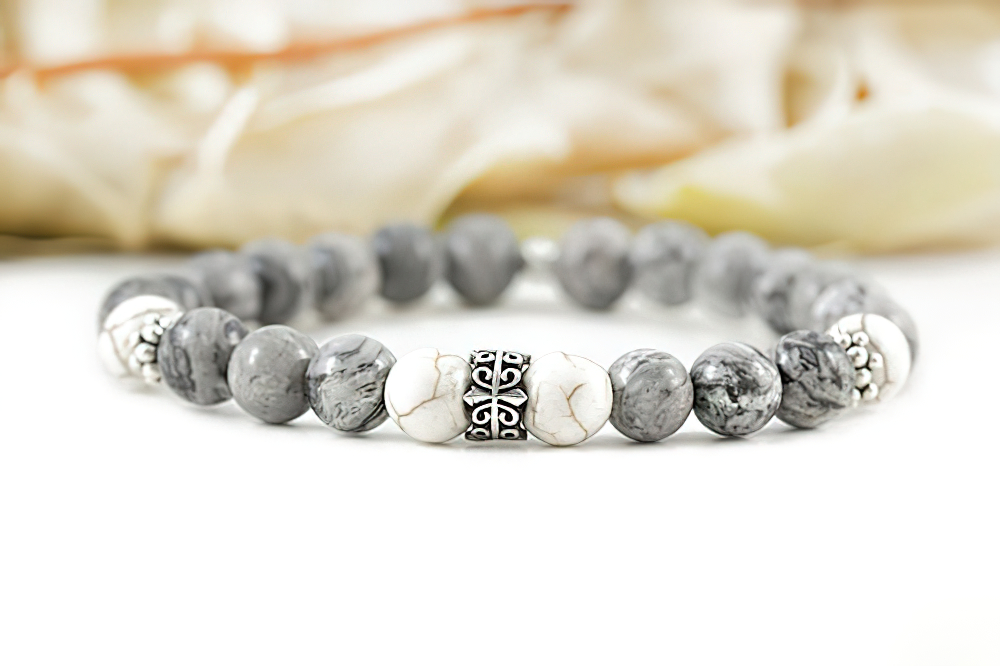 8mm high grade genuine silver onyx beads, howlite beads & 925 silver (Sterling) beads. The beads are chained together on a stretchable string. You can choose the size as men size or women size. Flexible (Suitable for wrists up to 9). All our products are supplied in a Stylish Jewelry Gift Box.
