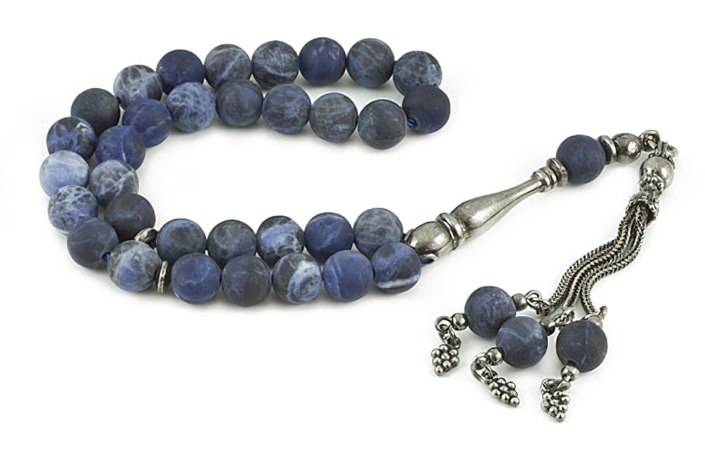 Handcrafted of 33 high grade genuine sodalite beads, Sterling silver spacers, handle and tassel. The spacing between the beads is around 2-3 beads wide. All our products are supplied in a Stylish Jewelry Gift Box.