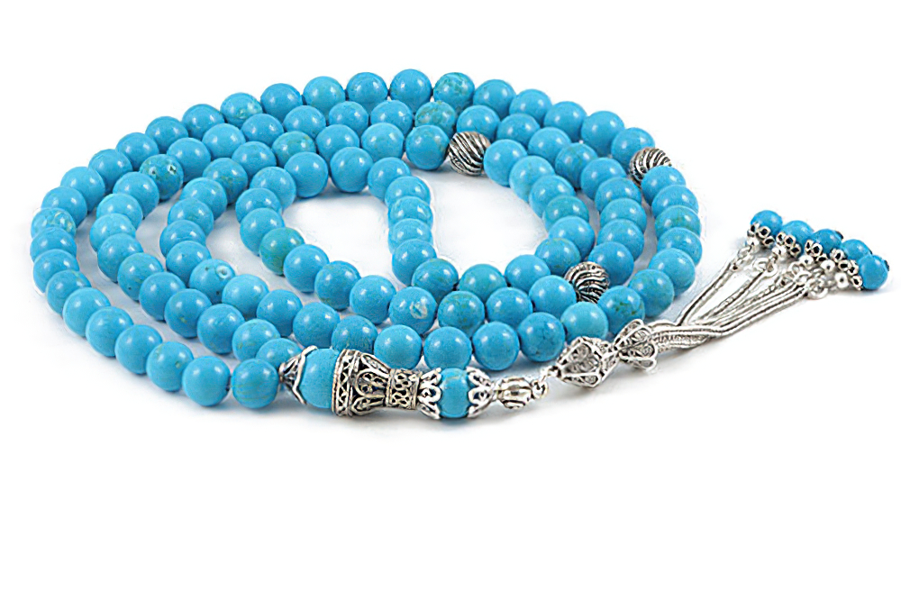 Handcrafted of 108 high grade genuine African turquoise beads, Sterling silver seperators, handle and tassel. Free of Charge Worldwide Delivery. All our products are supplied in a Stylish Jewelry Gift Box.