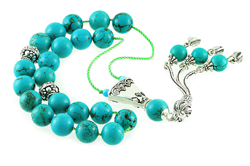 Handcrafted of 21 high grade genuine turquoise beads, two silver seperator beads, handle and tassel. Free of Charge Worldwide Delivery. All our products are supplied in a Stylish Jewelry Gift Box.
