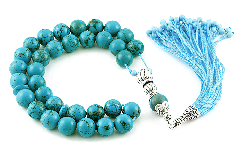 Handcrafted of 33 high grade genuine Tibetan turquoise beads, Sterling silver spacers, handle and beaded natural cotton tassel. Free of Charge Worldwide Delivery. All our products are supplied in a Stylish Jewelry Gift Box.
