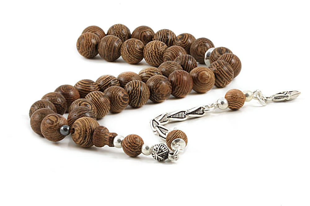 Handcrafted of 33 wengewood beads, handle and 925 silver (Sterling) tassel. All our products are supplied in a Stylish Jewelry Gift Box.