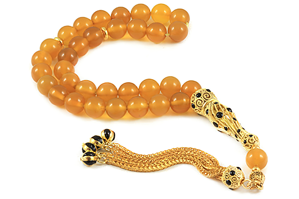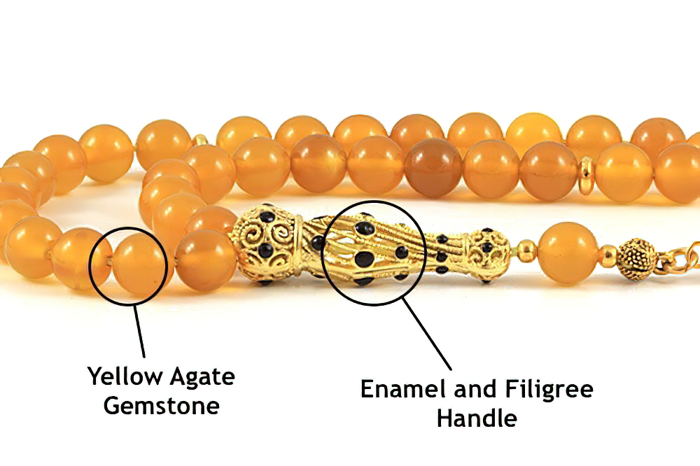Handcrafted of 33 high grade genuine agate beads finished with enamel and filigree handle & tassel. All prayer beads are supplied in a Stylish Jewelry Gift Box.