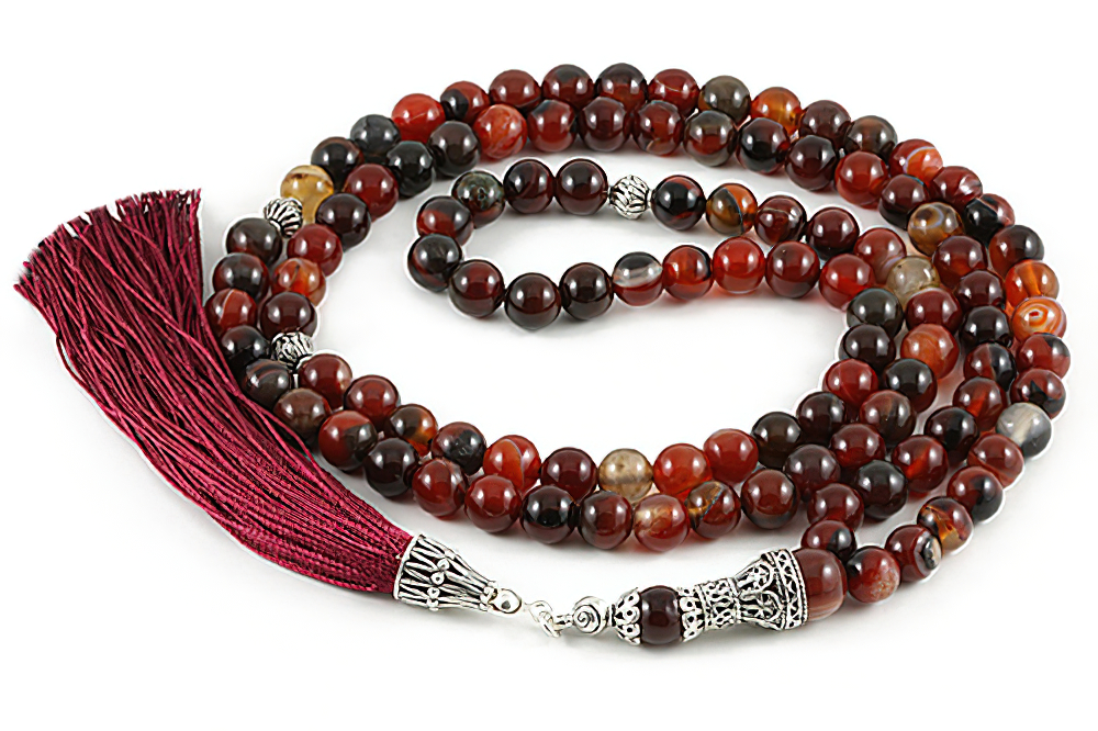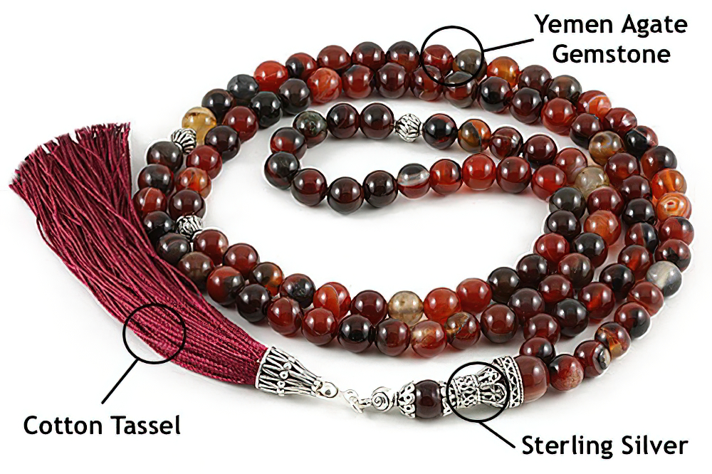Handcrafted of 108 high grade genuine Yemen agate beads, 925 silver (Sterling) spacers, handle and natural cotton tassel. Free of Charge Worldwide Delivery. All our products are supplied in a Stylish Jewelry Gift Box.
